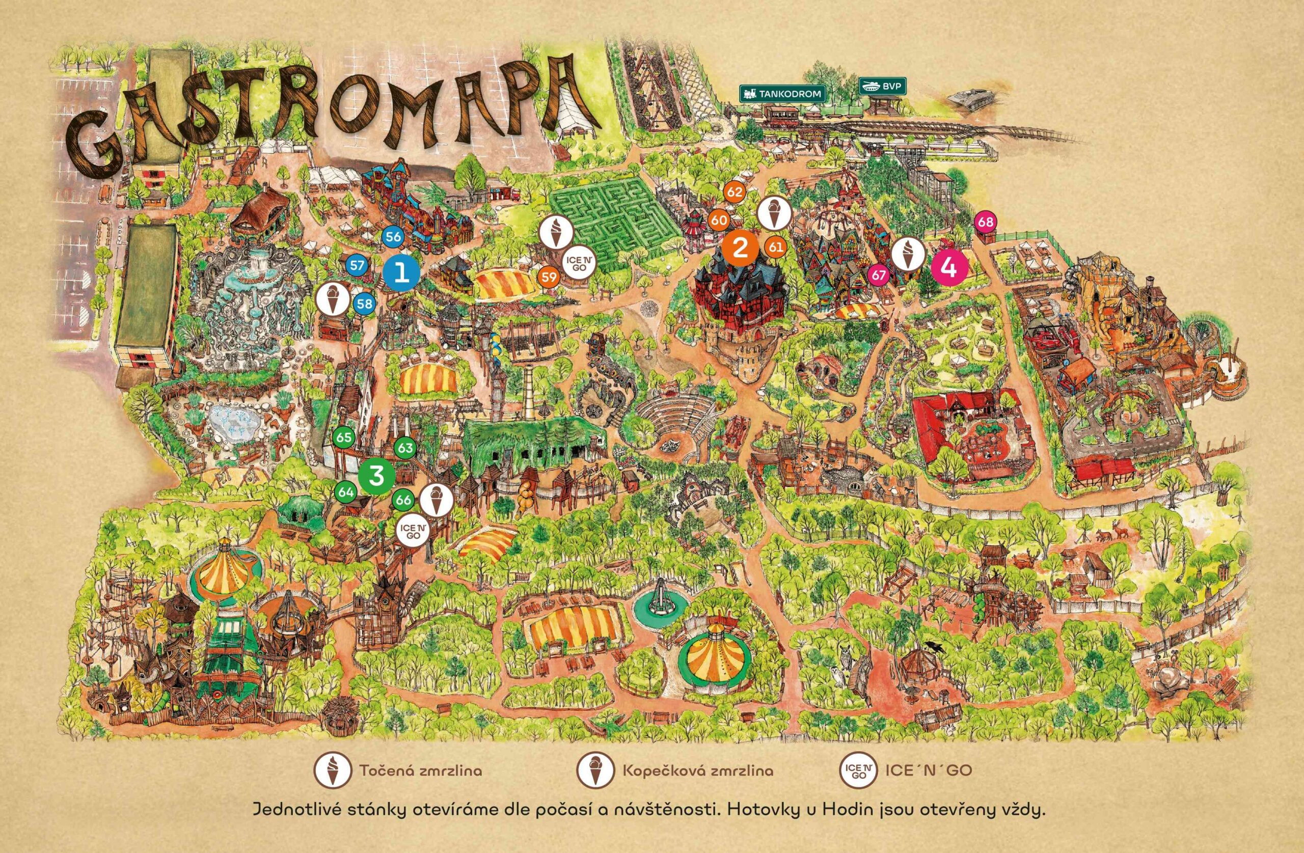 Jednotlivé gastro zóny a občerstvení otevíráme dle počasí a návštěvnosti parku Mirakulum