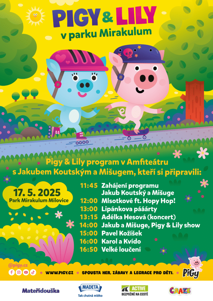 Zveme vás na další akci epických rozměrů! 17. května se koná Pigyáda v parku Mirakulum. Celým dnem vás provedou prasátka Pigy & Lily, která si pozvala spoustu skvělých hostů, kteří zabaví malé i velké, a na všechny čeká bohatý doprovodný program, zábavné soutěže a dárky! Park je otevřen od 10:00 hodin, program začíná v 11:45 hodin.